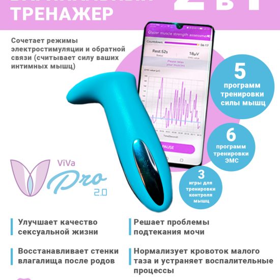 Тренажер Viva V-Pro 2.0 – это НОВЕЙШИЙ уникальный вагинальный тренажер 2 в 1, который сочетает режимы электростимуляции и обратной связи (считывает силу ваших интимных мышц). Устройство является полностью беспроводным и управляется при помощи приложения на мобильном телефоне. В режиме электростимуляции Вы пассивно тренируете мышцы микротоками. В режиме обратной связи Вы напрягаете интимные мышцы и видите на экране телефона, насколько сильно Вы их напрягаете, что делает тренировку максимально эффективной. В устройстве представлены большое количество программ, настроек и опций, которые позволят Вам составить индивидуальную тренировочную программу. Также V-Pro 2.0 имеет интерактивные игровые программы, позволяющие достичь скорейшего результата